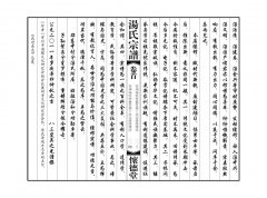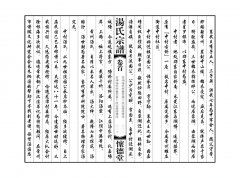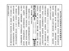 湯氏,我國百家大姓第九十位。出自子姓,黃帝五世孫子契,助夏禹治水有功,封于商(今河南商丘),為商族始祖。傳十四世成湯,滅夏建商,湯王后裔以祖名為姓,稱湯氏本宗始祖湯和。卷一:偉人論譜、第十次續修序、名人賀詞、資助者風采、人物志、續修凡例、一覽表、文化拾錦、歷次續修分譜序、分祠記、湯姓探源、原家規、祠墓祠志卷二:碑記、人物傳序、修譜名錄、五宗圖卷三至卷七:世系世表。