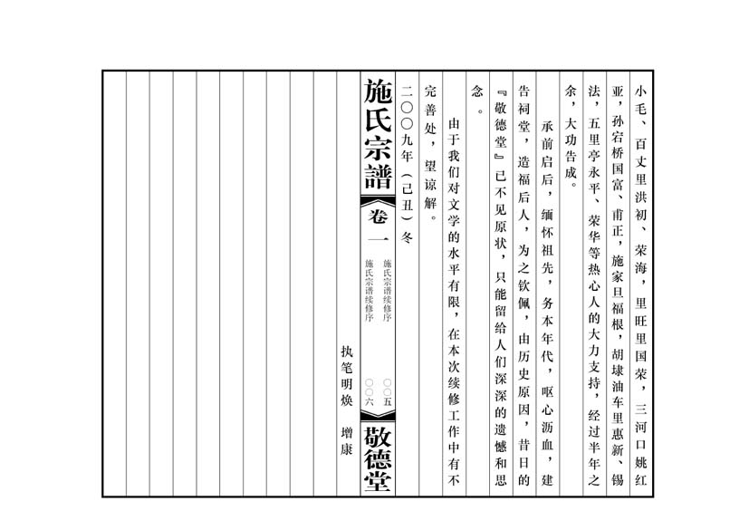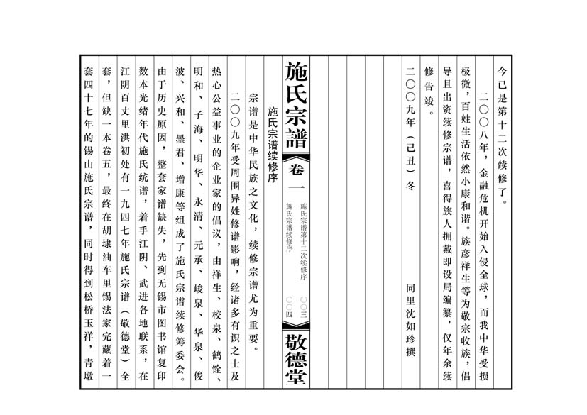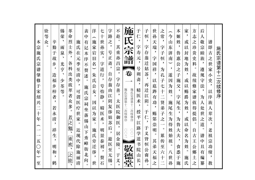 · 提 要自古王公鄉土之家,或以封地為姓,或以賜爵為姓,或以命名為姓。施氏本姬姓,魯惠公之子施父,字尾生,為魯大夫,食悉于施(今山東濟南),遂因為姓。施尾生為得姓始祖。八世孫之常,字子恒,為孔子七十二賢弟子之一。累傳至六十二世孫天瑞,字國祥,以扈蹕有功,賜第崇明。其弟天福之子恒,字存翁遷姑蘇,再遷江陰。于仁,于義皆恒公裔孫。于仁,字壽元,號朔齋,精醫術,授平江路學道書院山長,不赴。其重孫昌宗,字存善,太醫院御醫,居金陵。于義,字路之,號正齋,自存翁由江陰復徏姑蘇后,遊醫至無錫。七十世孫實,字道行,號怡靜,精醫術,明景泰初,贅石洋(施家宕舊名)朱氏公女,因以為家。