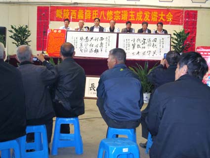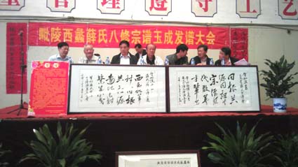 上午九點四十八分名譽會長薛寶松宣布《毗陵西蠡三鳳堂薛氏宗譜》繕成問世,弘發慶典正式開始。(鳴炮奏樂)然后薛寶松代表毗陵西蠡薛氏宗族家族和八修委員會向來賓致歡迎詞,向來參加慶典的全部來賓表示熱烈的歡迎。接著有毗陵西蠡薛氏八修委員會會長薛傳方先生、主編薛庚良先生、最后一任西蠡薛氏族長薛灝正之孫、副會長薛瑞青先生、原常州市副市長薛鋒先生、相繼講話與發言。再有山西省原原城日報社總編萬榮薛氏文化研究會會長薛禮堂、暨陽薛氏薛煒清先生代表莘村、板橋同宗分支宣讀了熱情洋溢祝賀信。常州市譜牒文化研究會執行會長、武進譜牒文化研究會會長吳之光先生宣讀了頒譜慶典賀詞。
