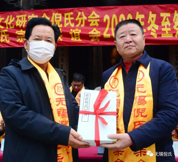 在2020年12月27日召開的無錫祠堂文化研究會倪氏分會、無錫倪氏宗親聯誼會第三屆理事會上,捐贈者倪海增(右)將百年家譜復印件贈送給創始人、首任會長倪增興作為紀念。